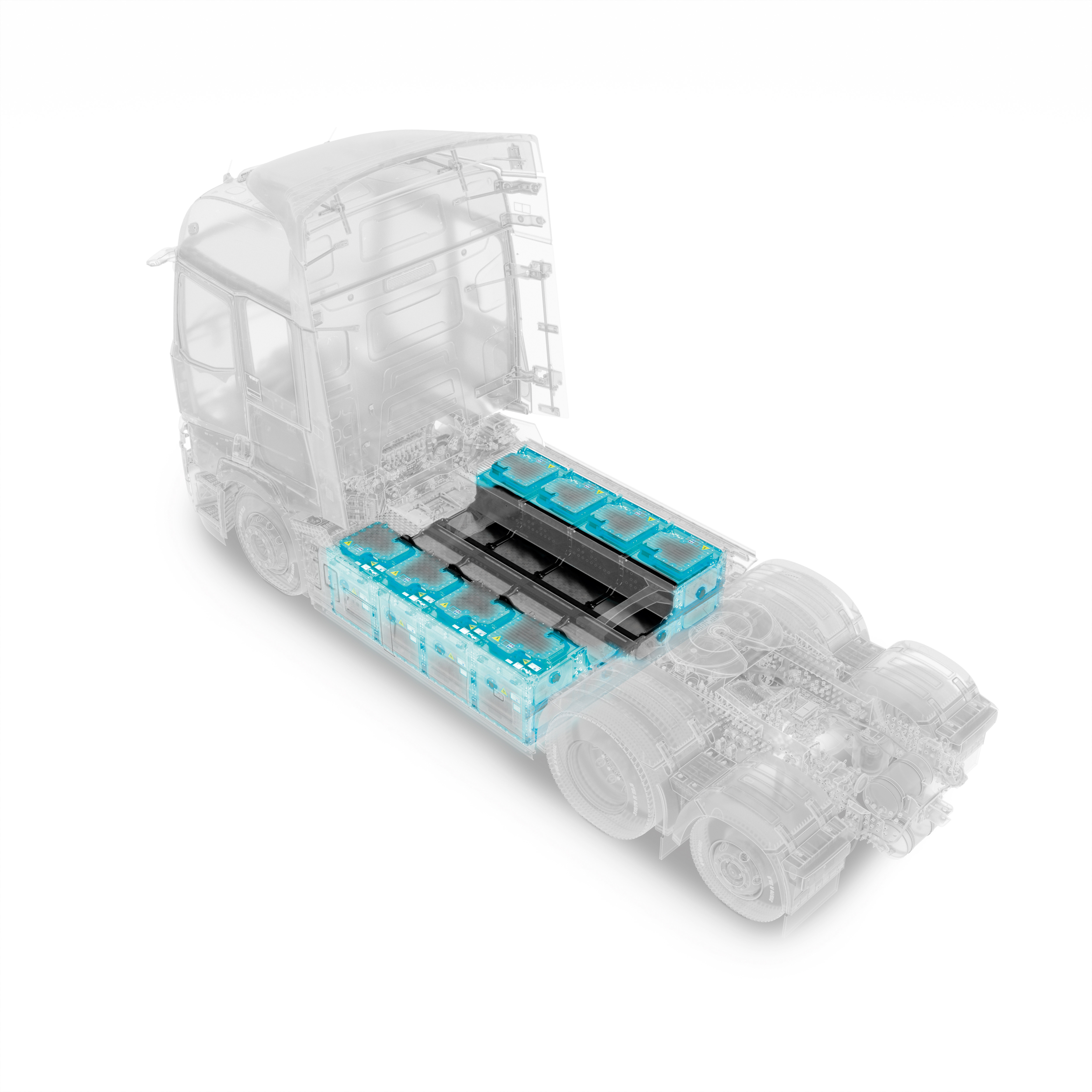 De toegenomen actieradius is mede te danken aan een innovatieve elektrische aangedreven achteras – een nieuwe E-axle-configuratie – waarbij elektromotoren en transmissie in de achteras zijn geïntegreerd. Hierdoor ontstaat extra ruimte tussen de chassis langsliggers om extra batterijcapaciteit te plaatsen.